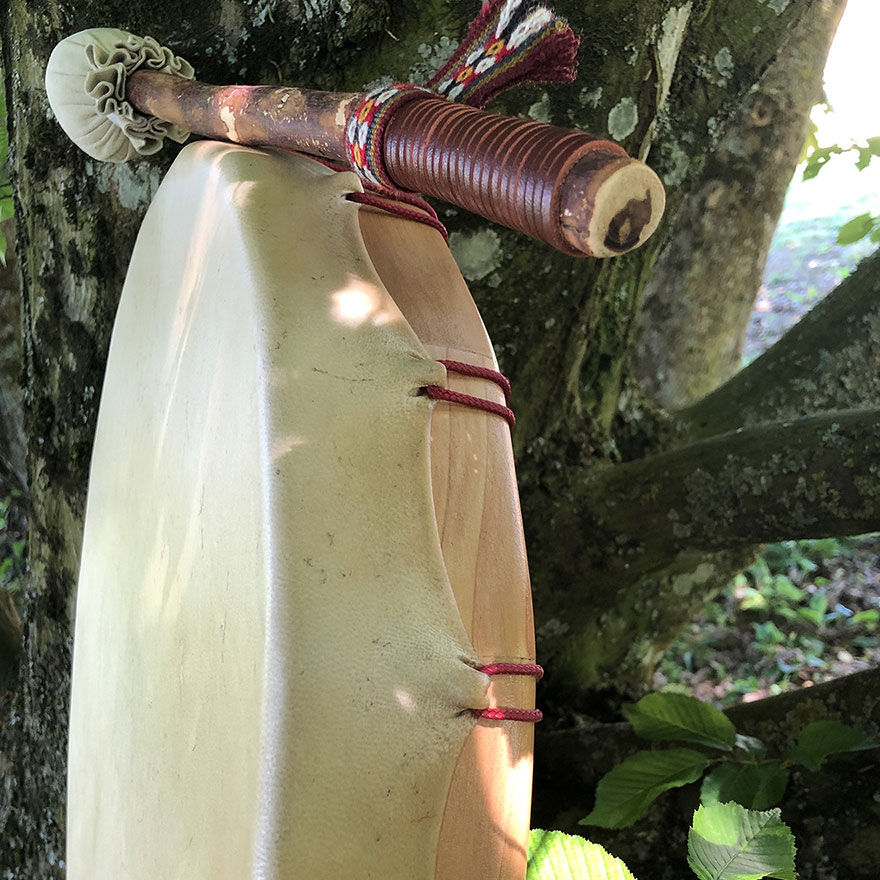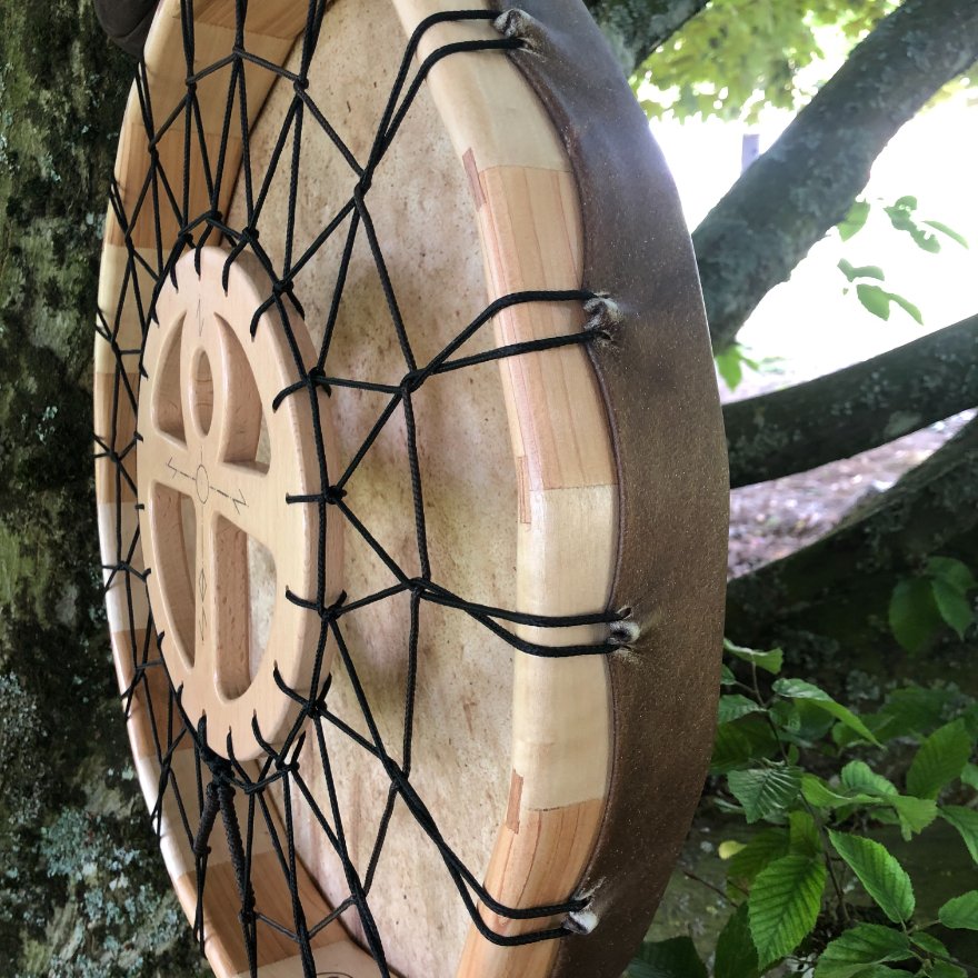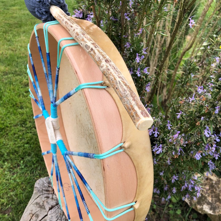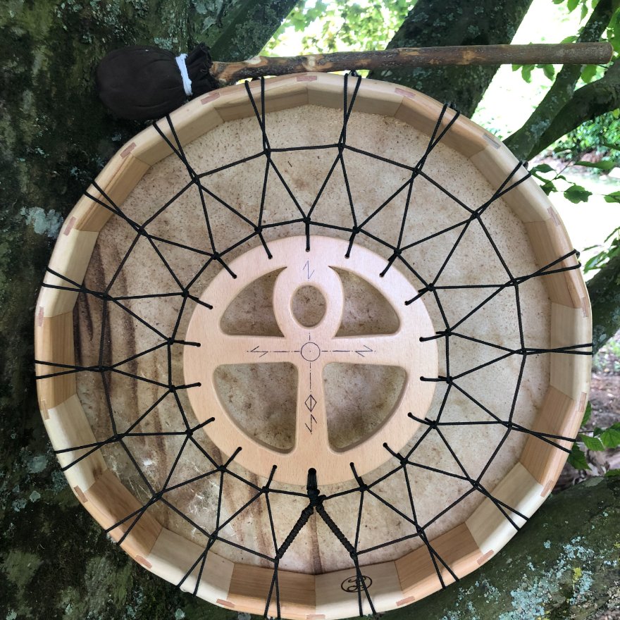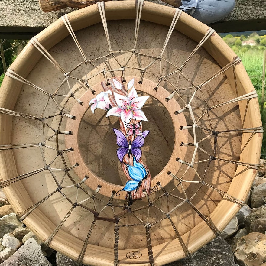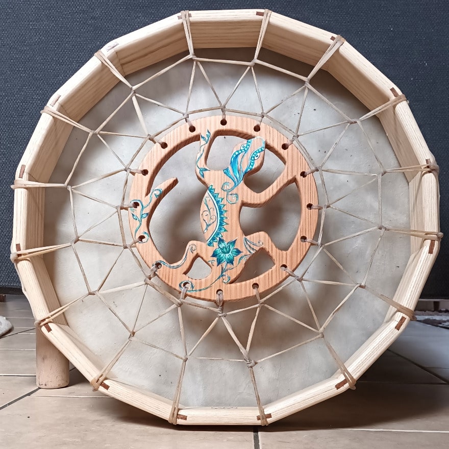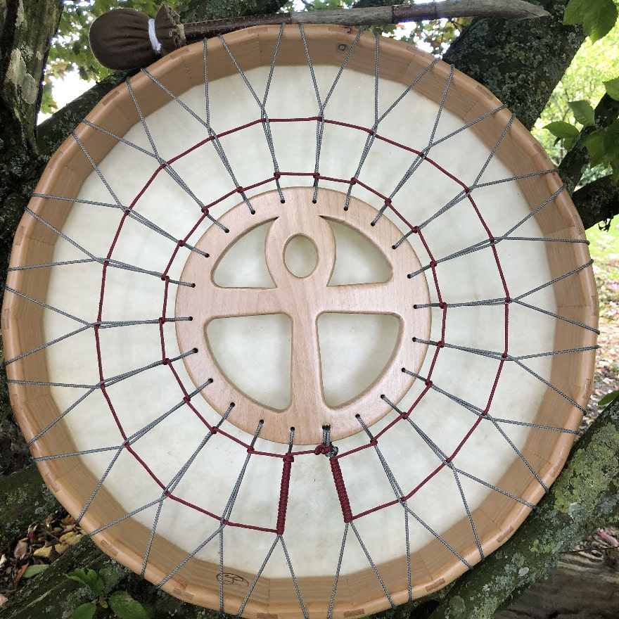 Ce tambour entièrement personnalisé porte différents symbole afin d'apporter des énergies complémentaires.
