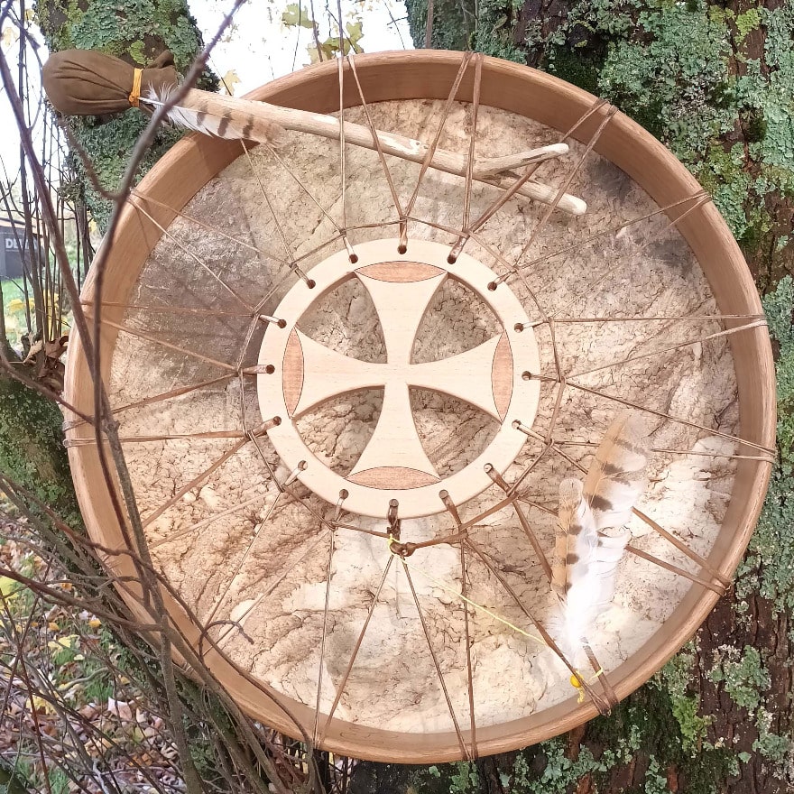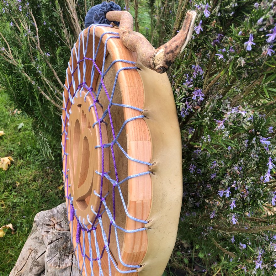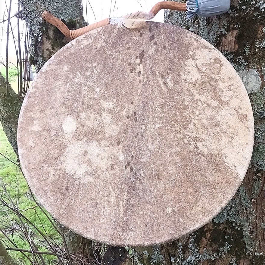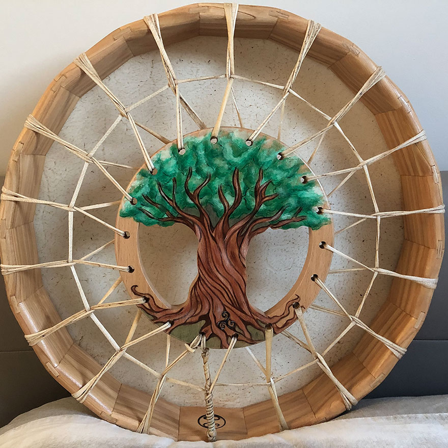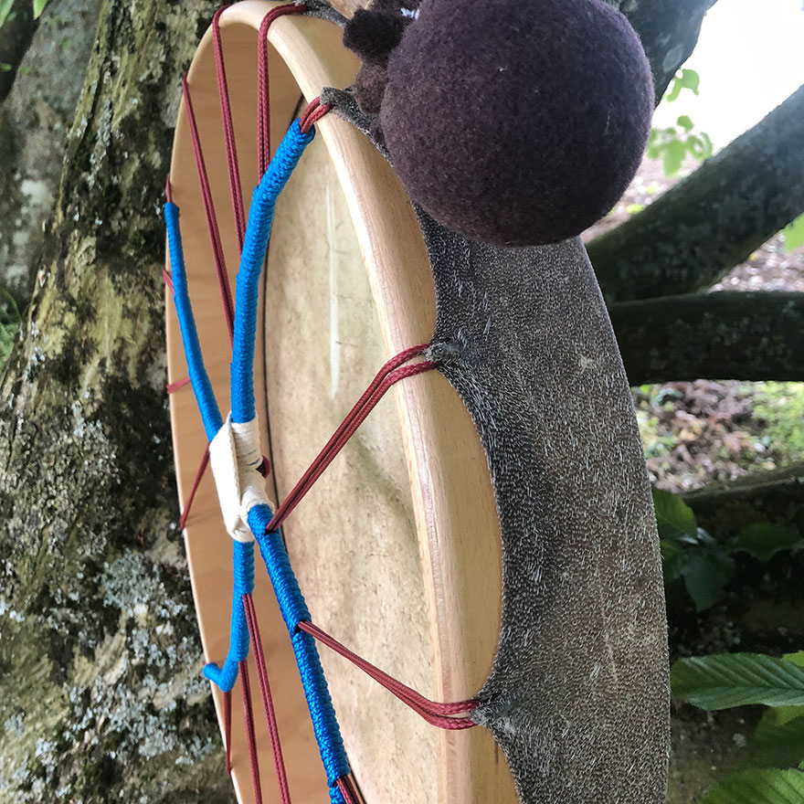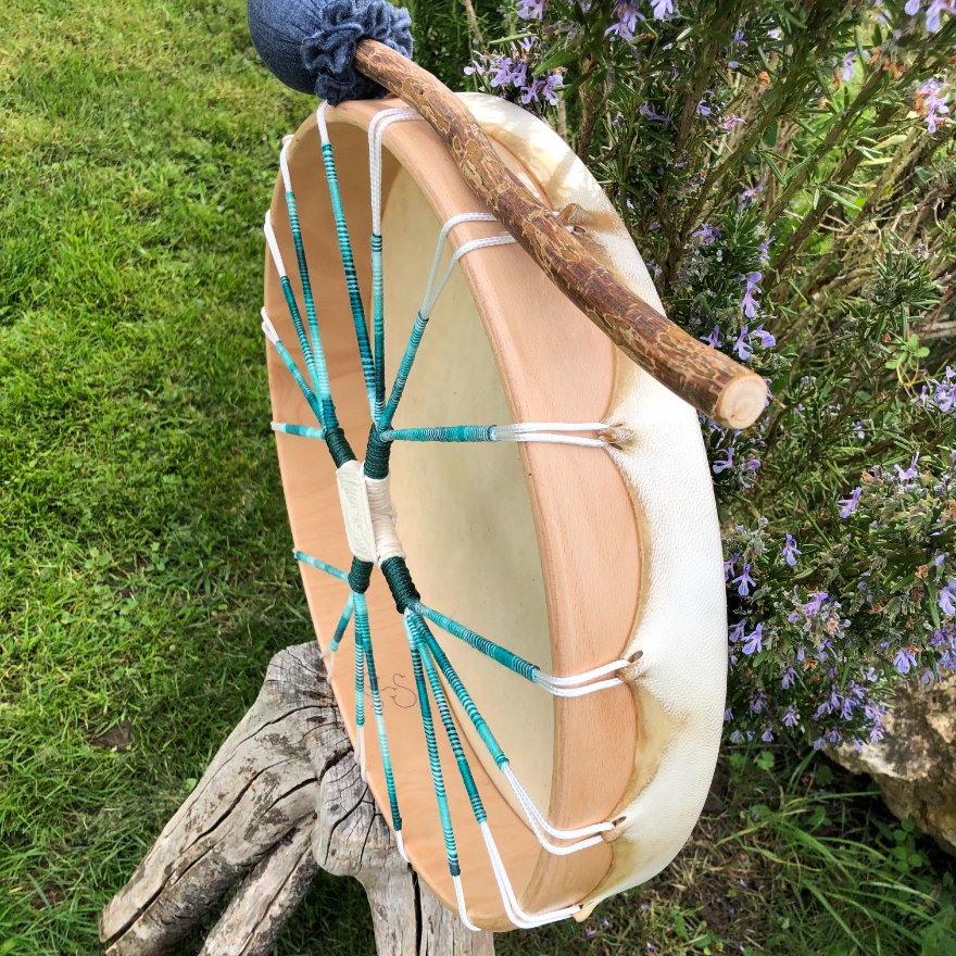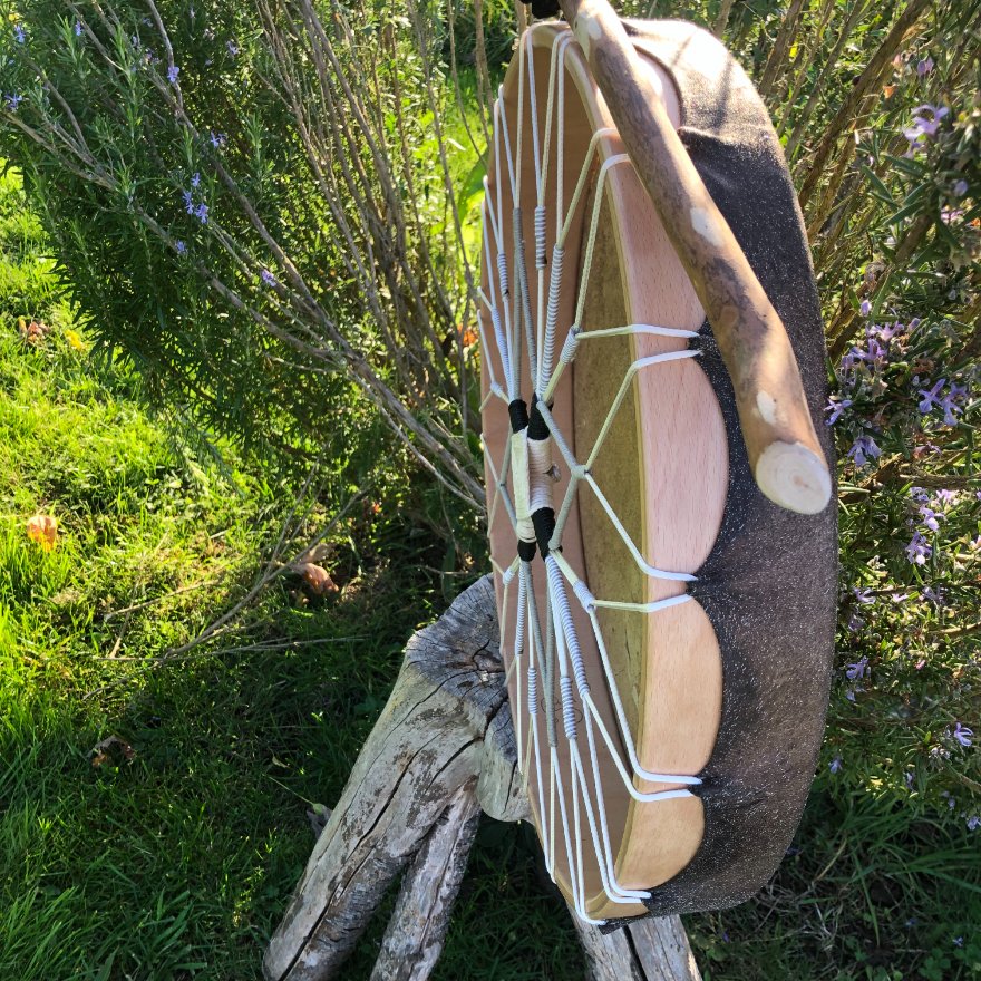 Ce tambour entièrement personnalisé porte différents symbole afin d'apporter des énergies complémentaires.