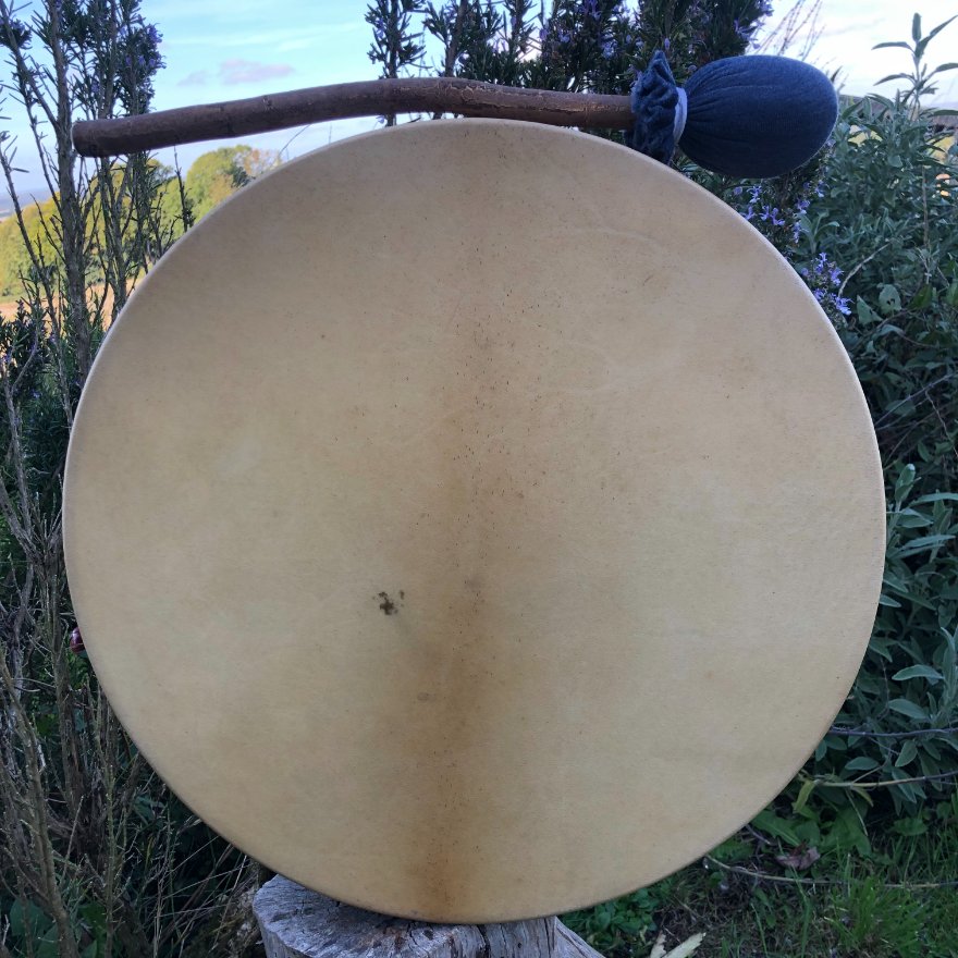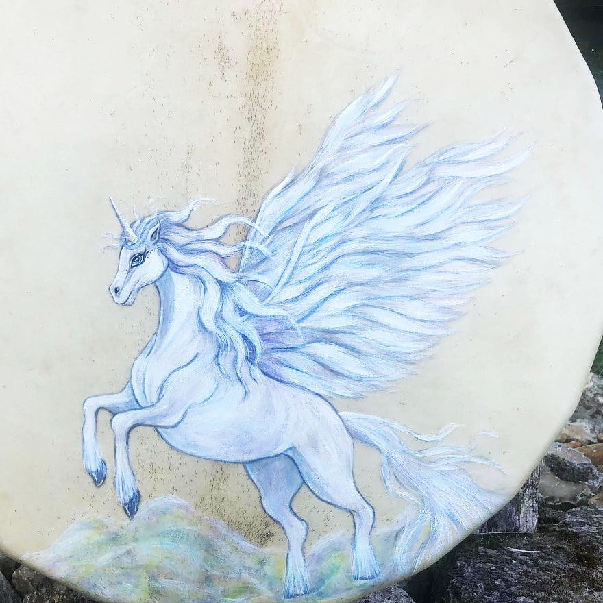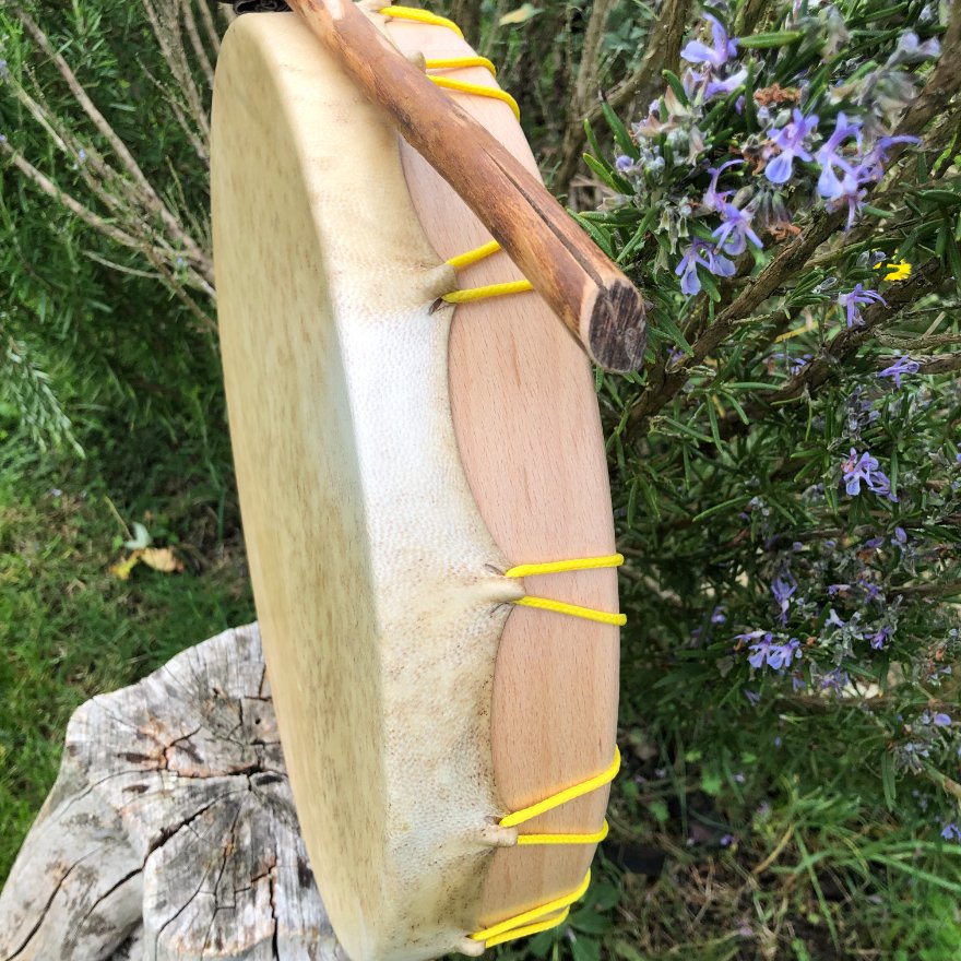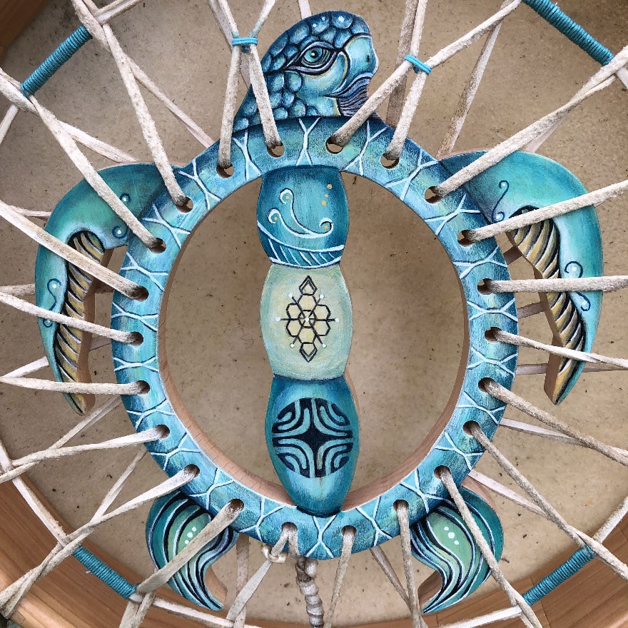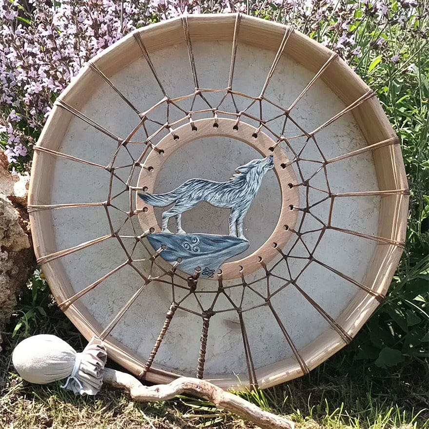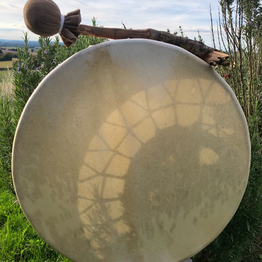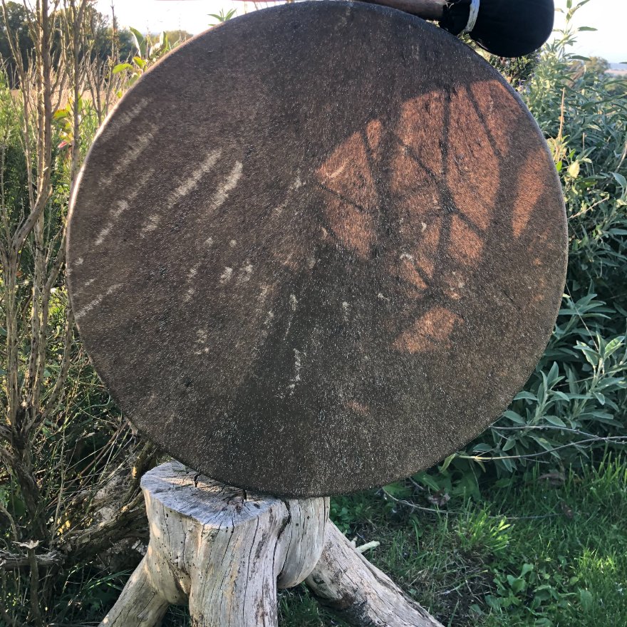 Ce tambour entièrement personnalisé porte différents symbole afin d'apporter des énergies complémentaires.