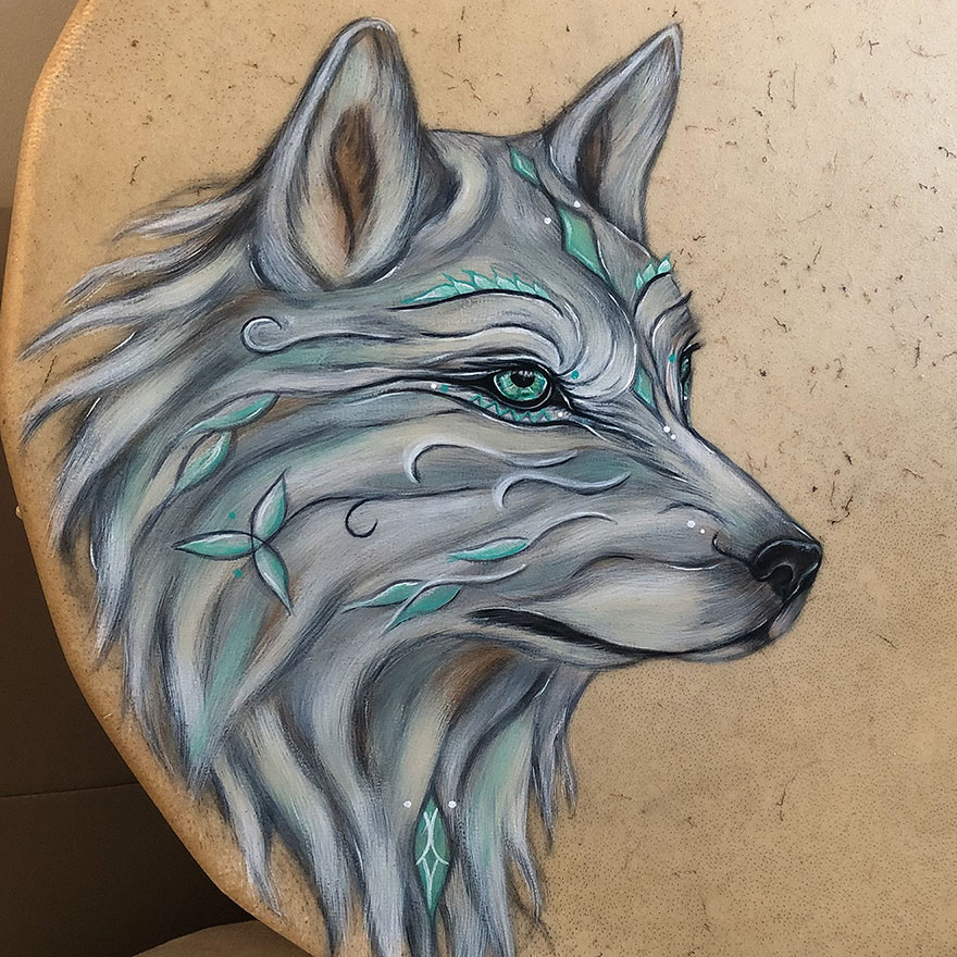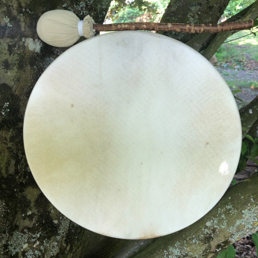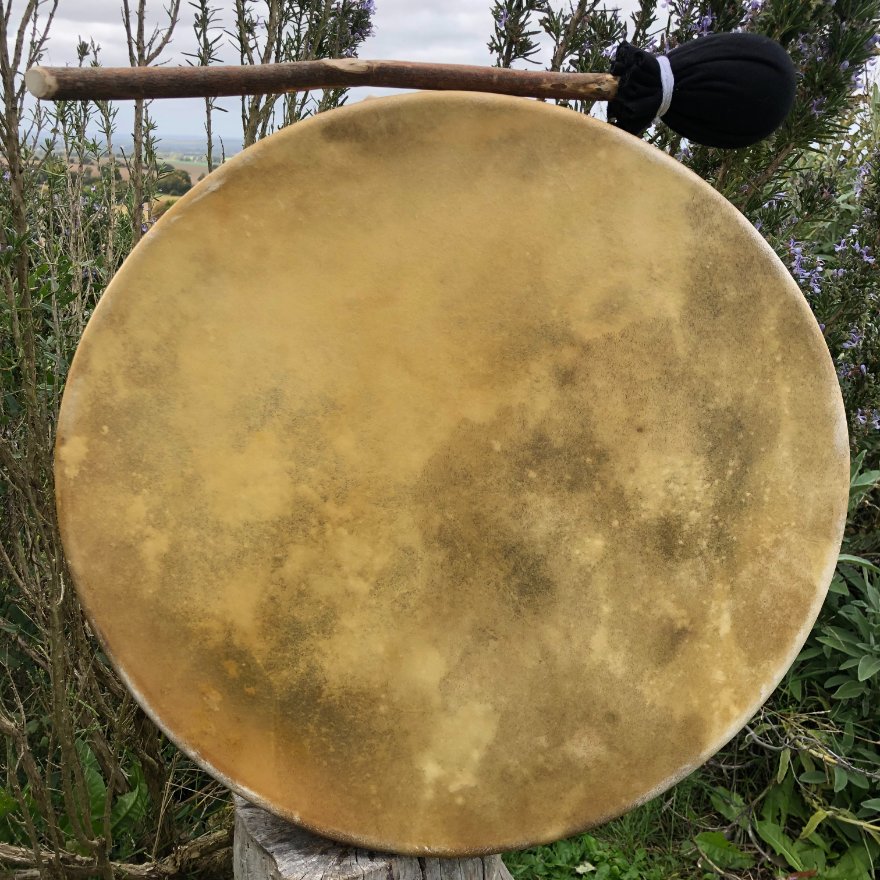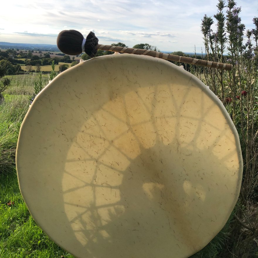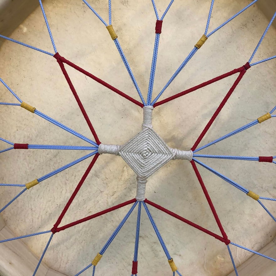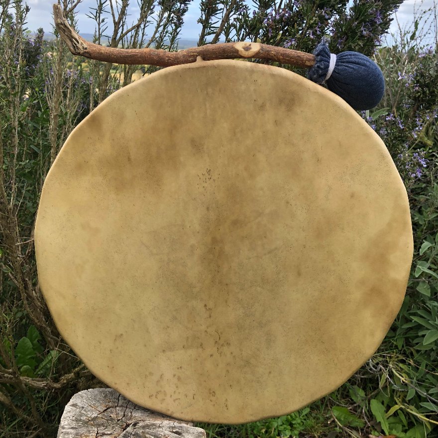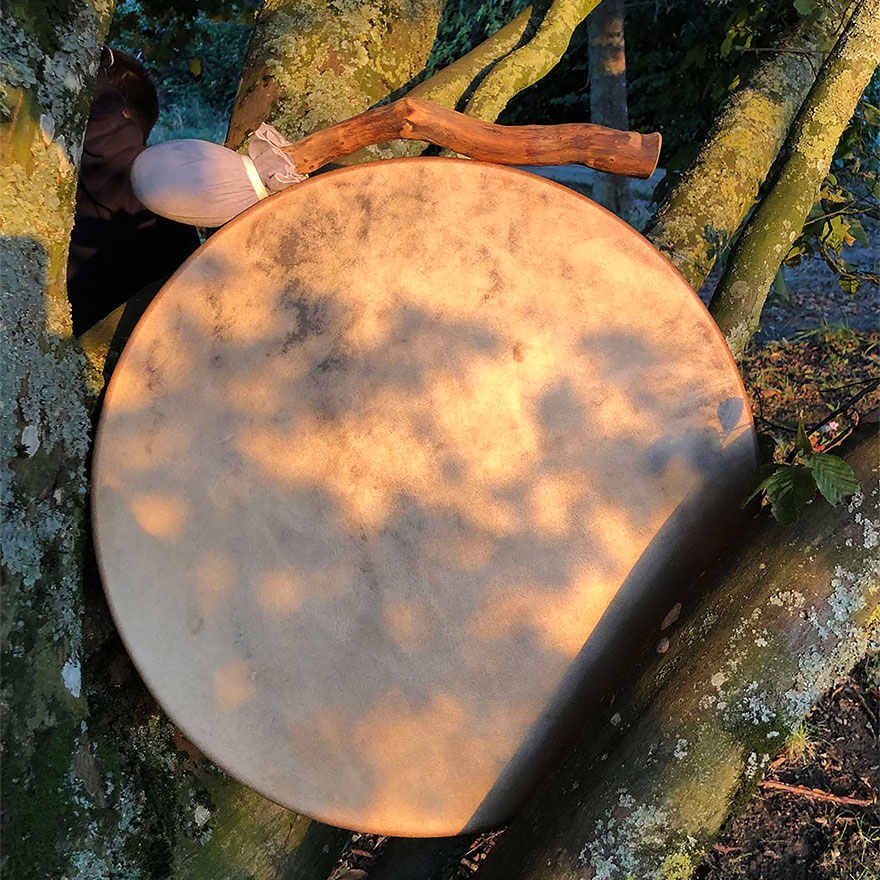 Ce tambour entièrement personnalisé porte différents symbole afin d'apporter des énergies complémentaires.