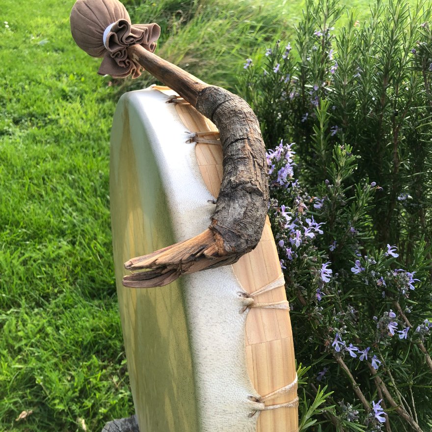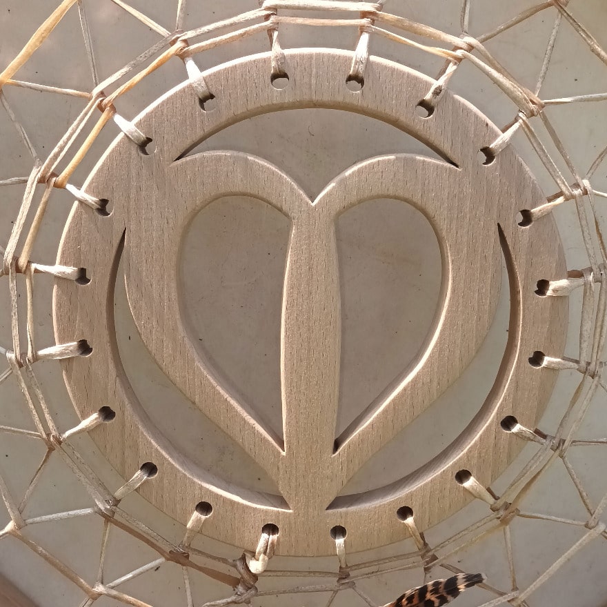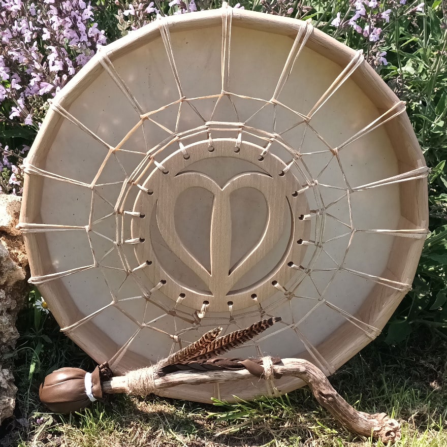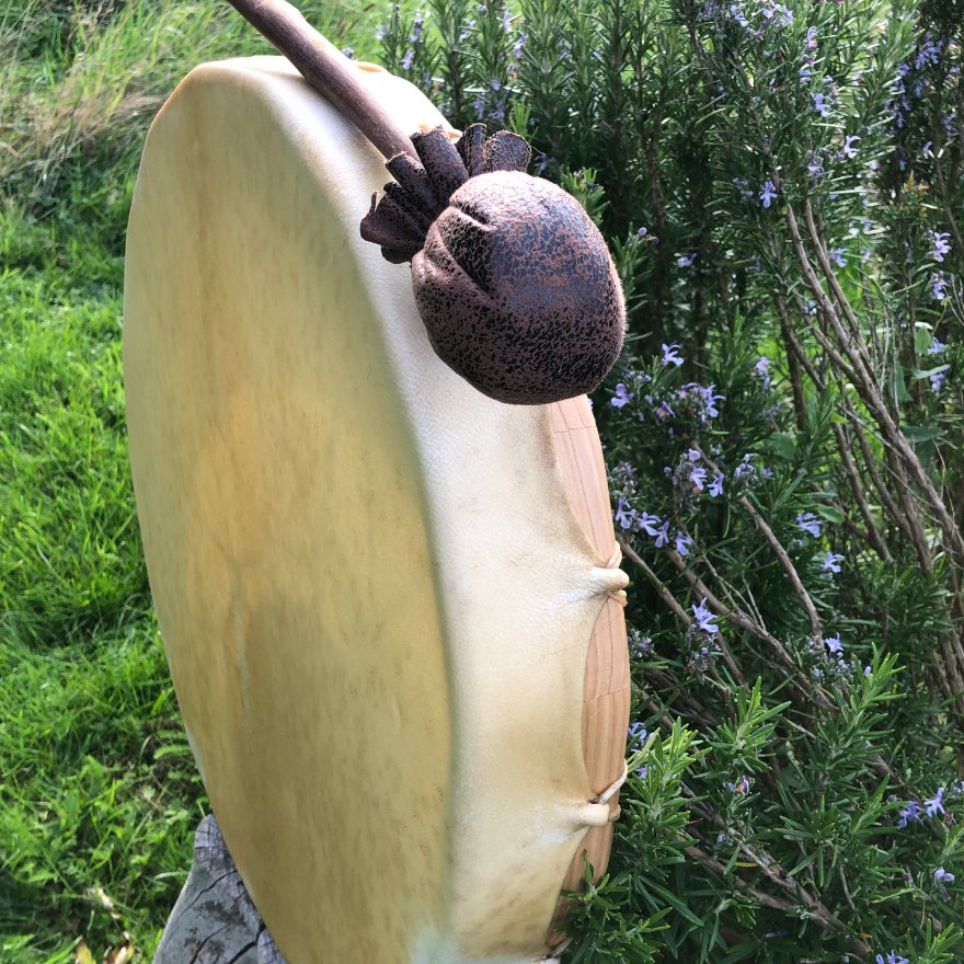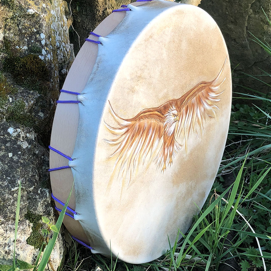 L’aigle diffuse sa clairvoyance et sa force puissante qui nous guide dans une meilleure vision. Il s’associe à Métatron dans une vibration de protection et dans cette reliance au divin, la petite coccinelle apporte sa touche légère et rassurante. La douceur et la puissance s’accordent comme deux notes de musique complémentaires dans ce tambour qui diffuse toute sa sagesse ancestrale et sa force d’ancrage par la peau de bison et le cèdre rouge.